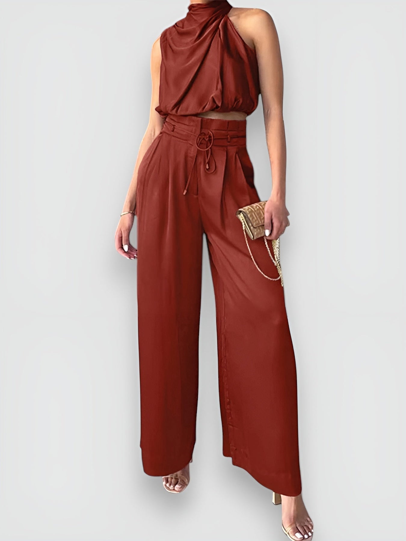 Questo elegante set è composto da un top senza maniche e pantaloni a gamba larga, perfetto per un look estivo sofisticato.